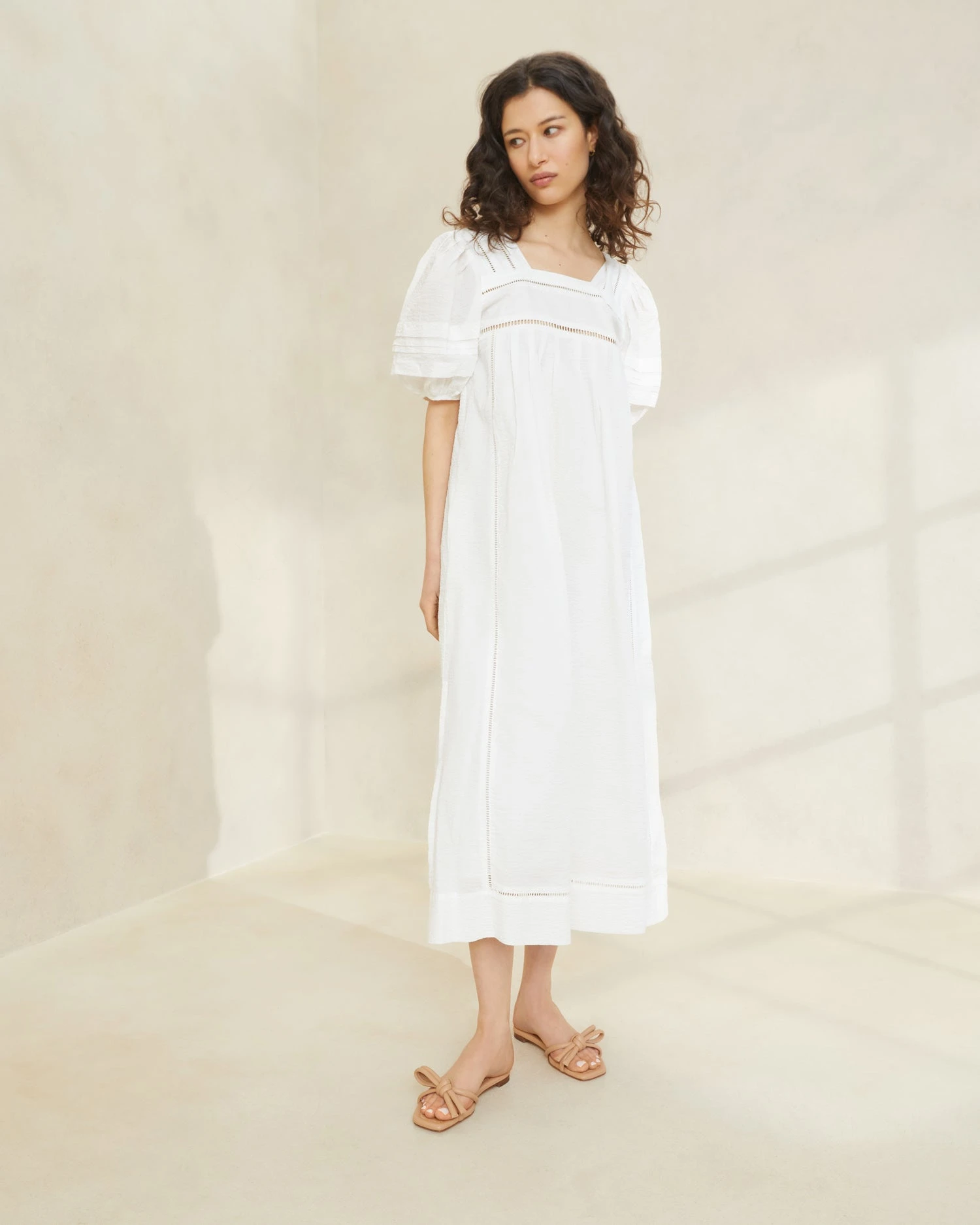 Long dress in white cotton. Features short, puffed sleeves, a square neckline, and ladder stitch embroidery.