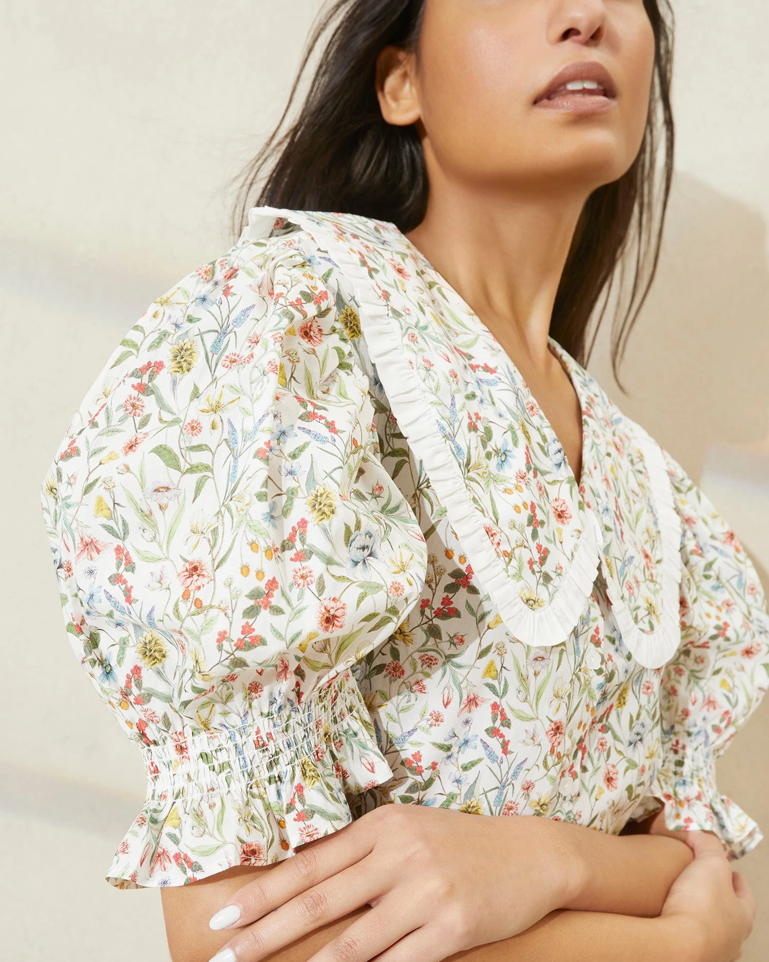 Short-sleeve blouse in multi-floral cotton with shades of cream, clover green, and poppy red. Features a ruffled, extended point collar and a buttoned placket.