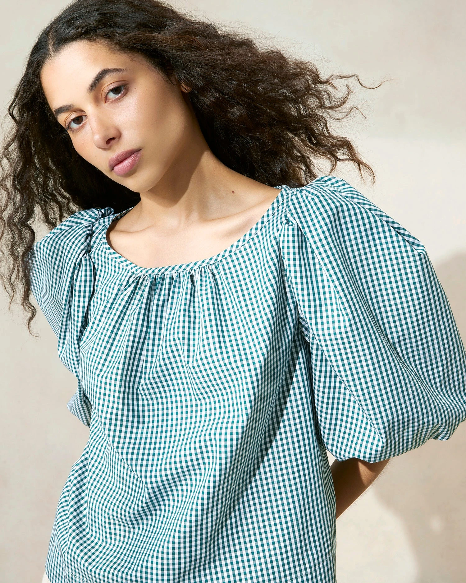 Oversized blouse, inspired by our Mimi dress, in mini green gingham-printed cotton. Ties at the back.