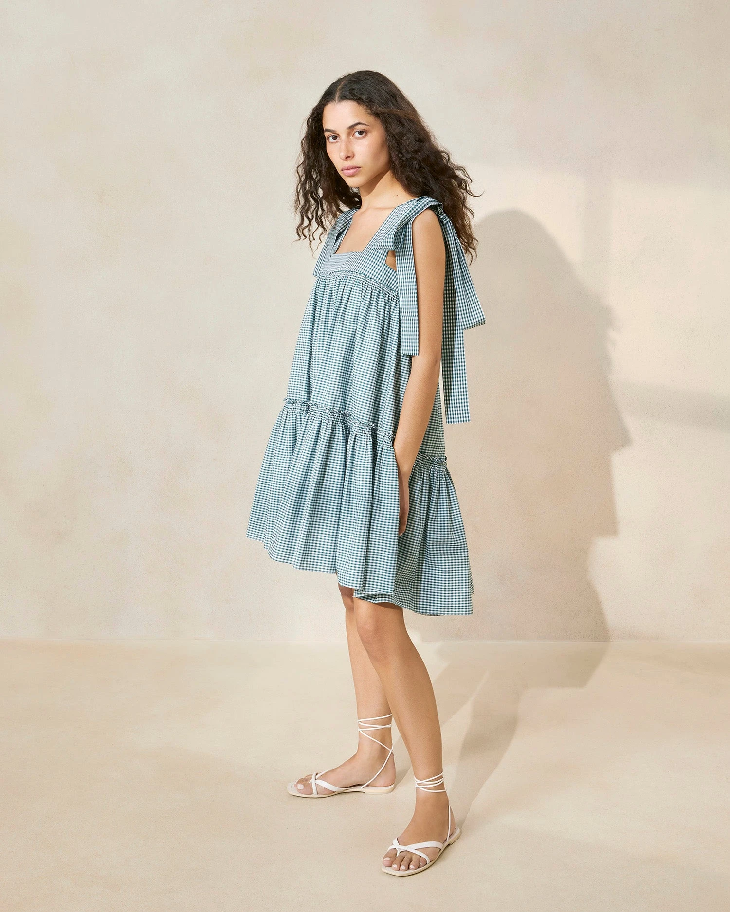 Mini ruffled-hem dress in mini green gingham-printed cotton. Features adjustable shoulder straps and a cotton lining.