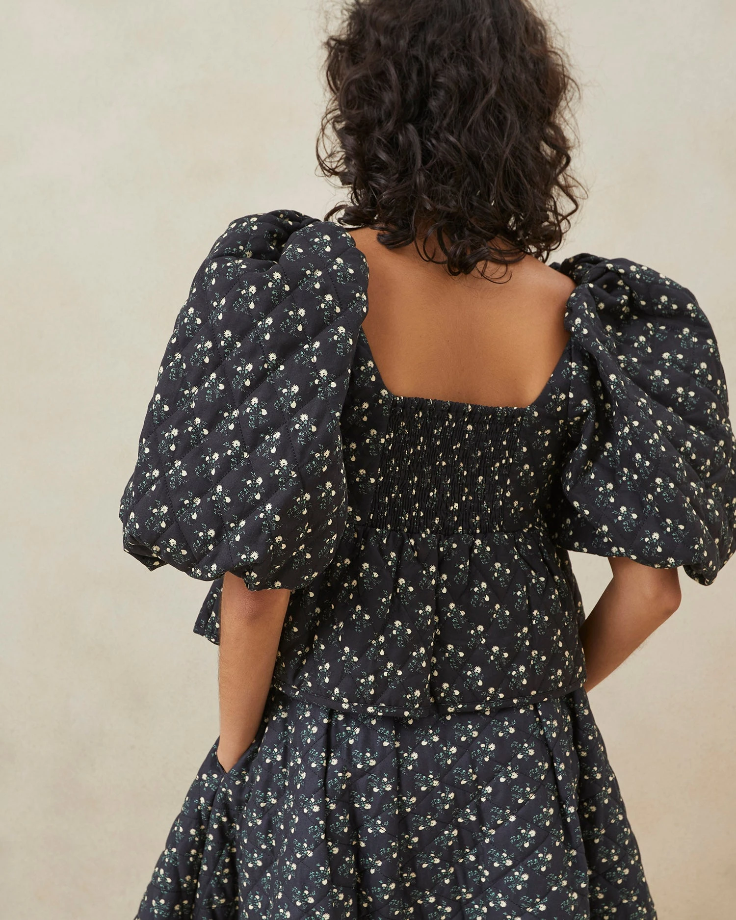 Puff-sleeved babydoll blouse in black ditsy floral quilted cotton. Features a rounded neckline, fitted waist, and flared hem.