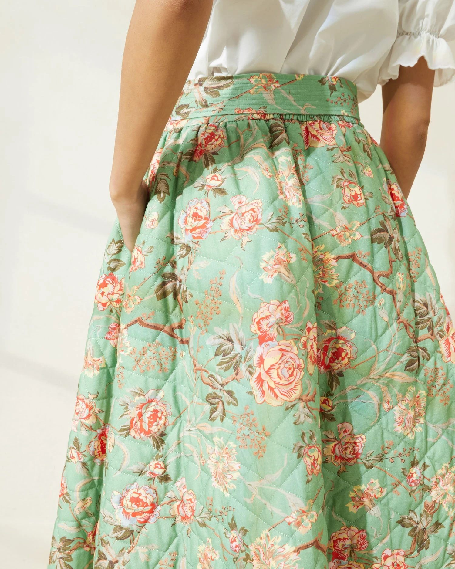 Long circle skirt in sage green botanical floral broadcloth. Features a side zipper and an adjustable, belted waist. Pairs beautifully with the matching
