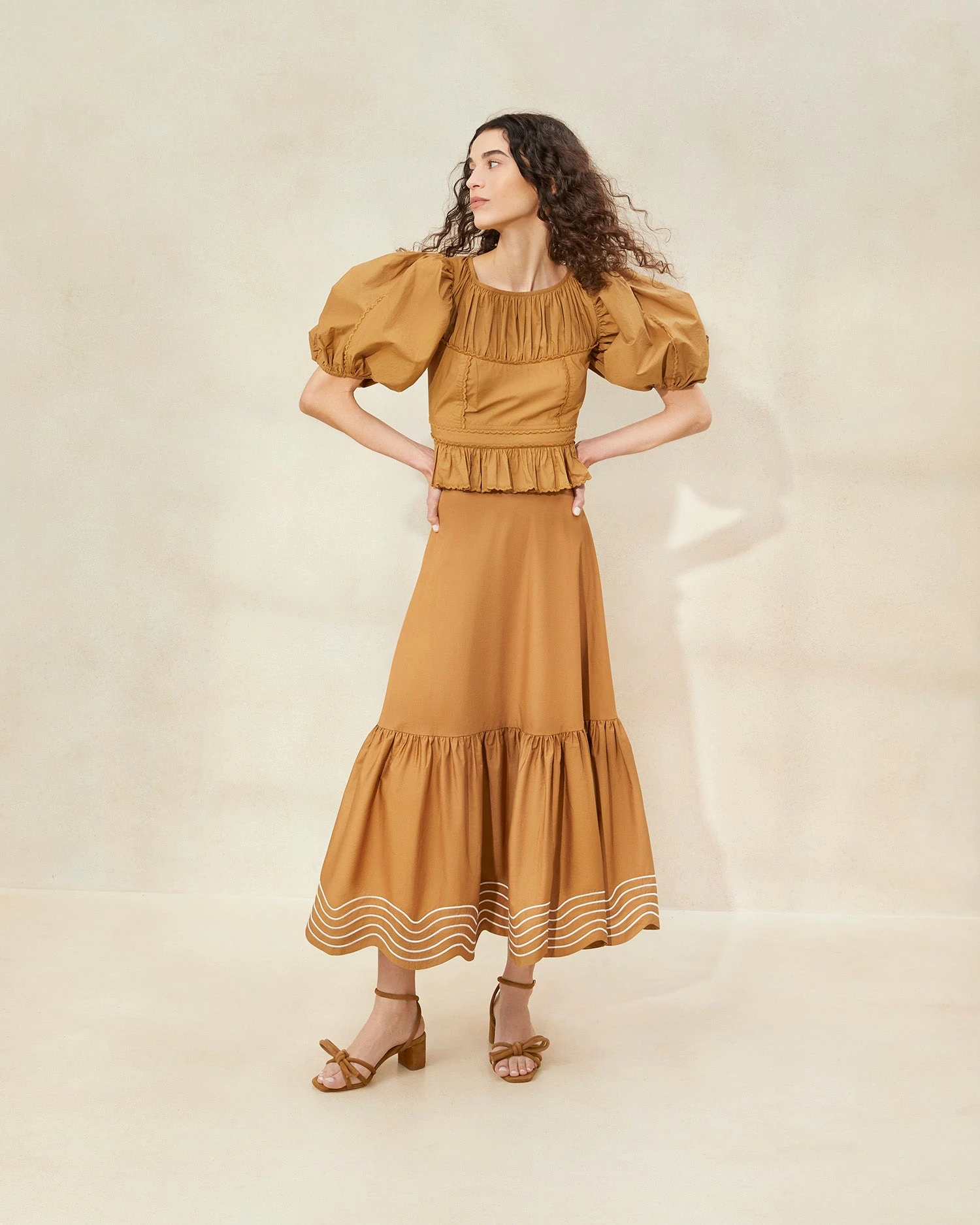 Long skirt in beautiful brown cotton. Features a fitted shape with a flared bottom. Zips closed with a concealed zipper at the left side.