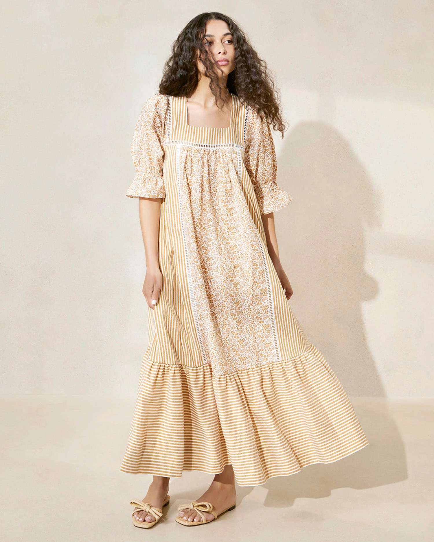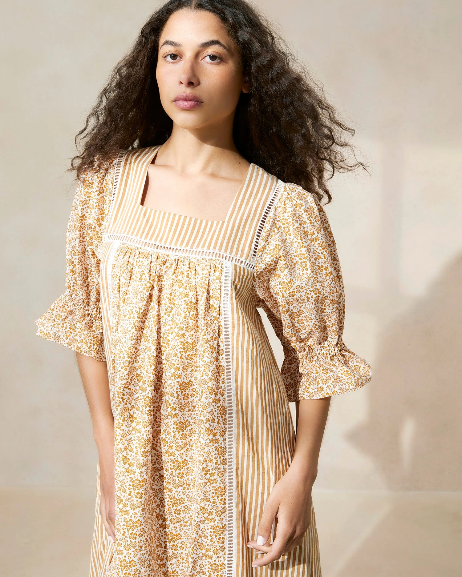 Square-neck dress with ladder eyelet trim in brown floral and stripe cotton. Features pockets and a cotton lining.
