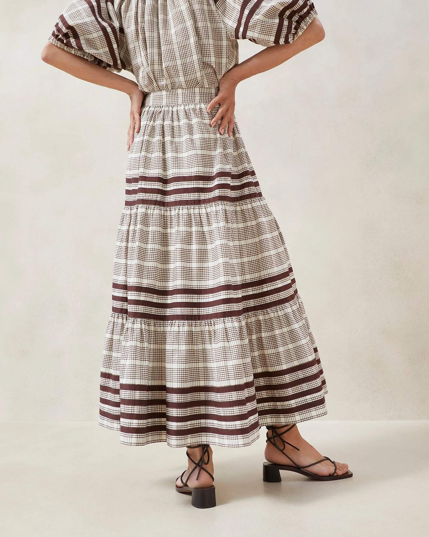 Tiered skirt in chocolate brown and cream-colored plaid cotton fabric with chocolate brown grosgrain ribbon trim. Features side pockets.