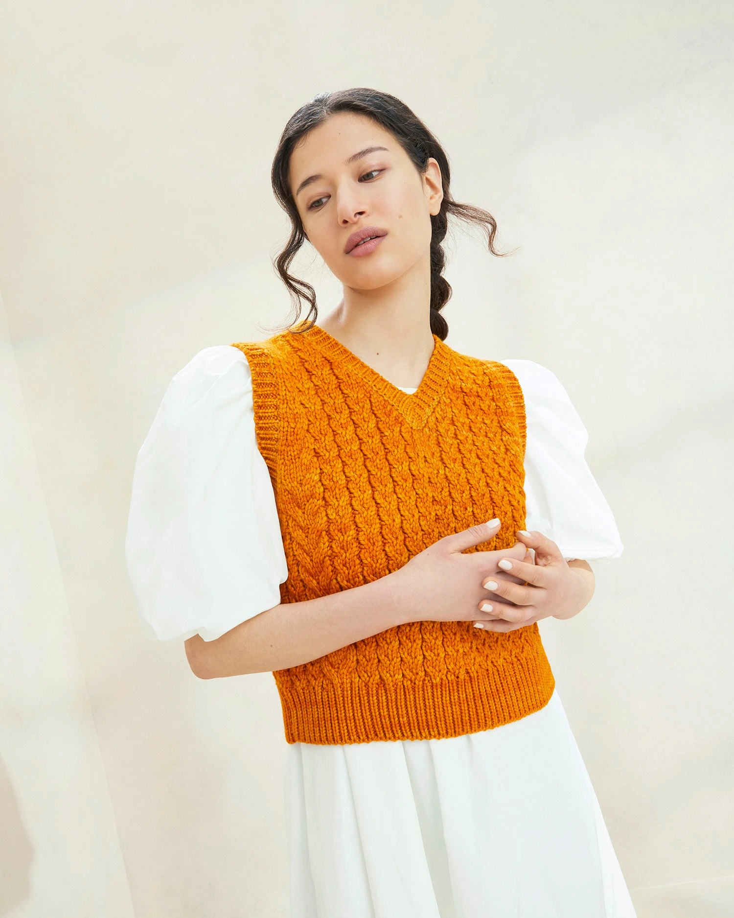 Crewneck sweater vest in sunset—a gorgeous burnt orange—wool.