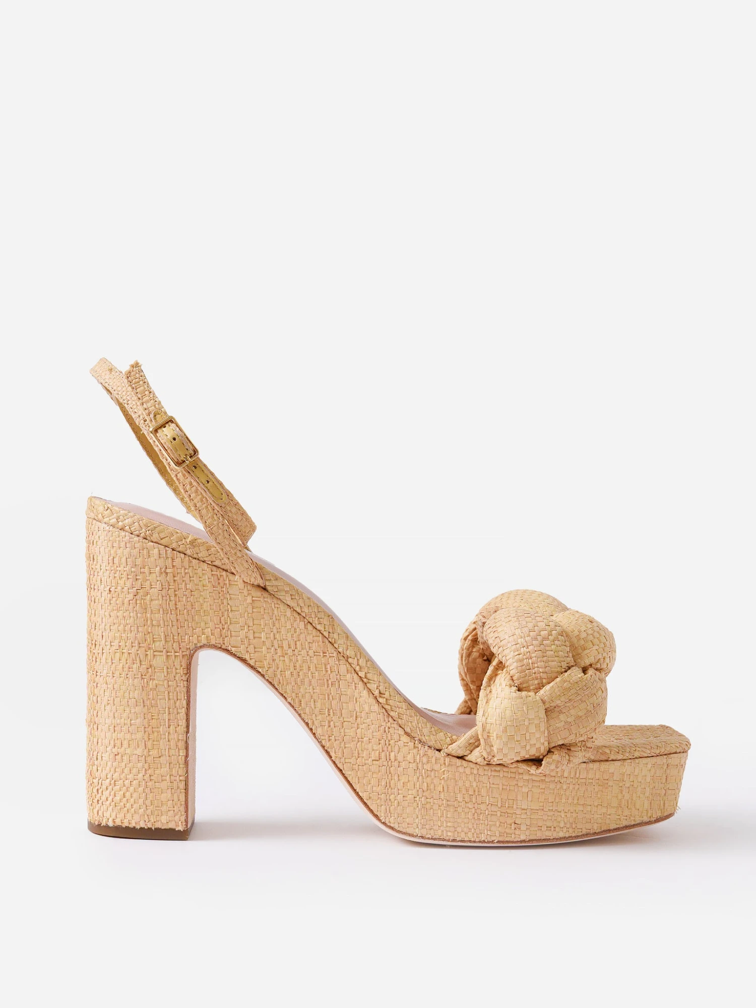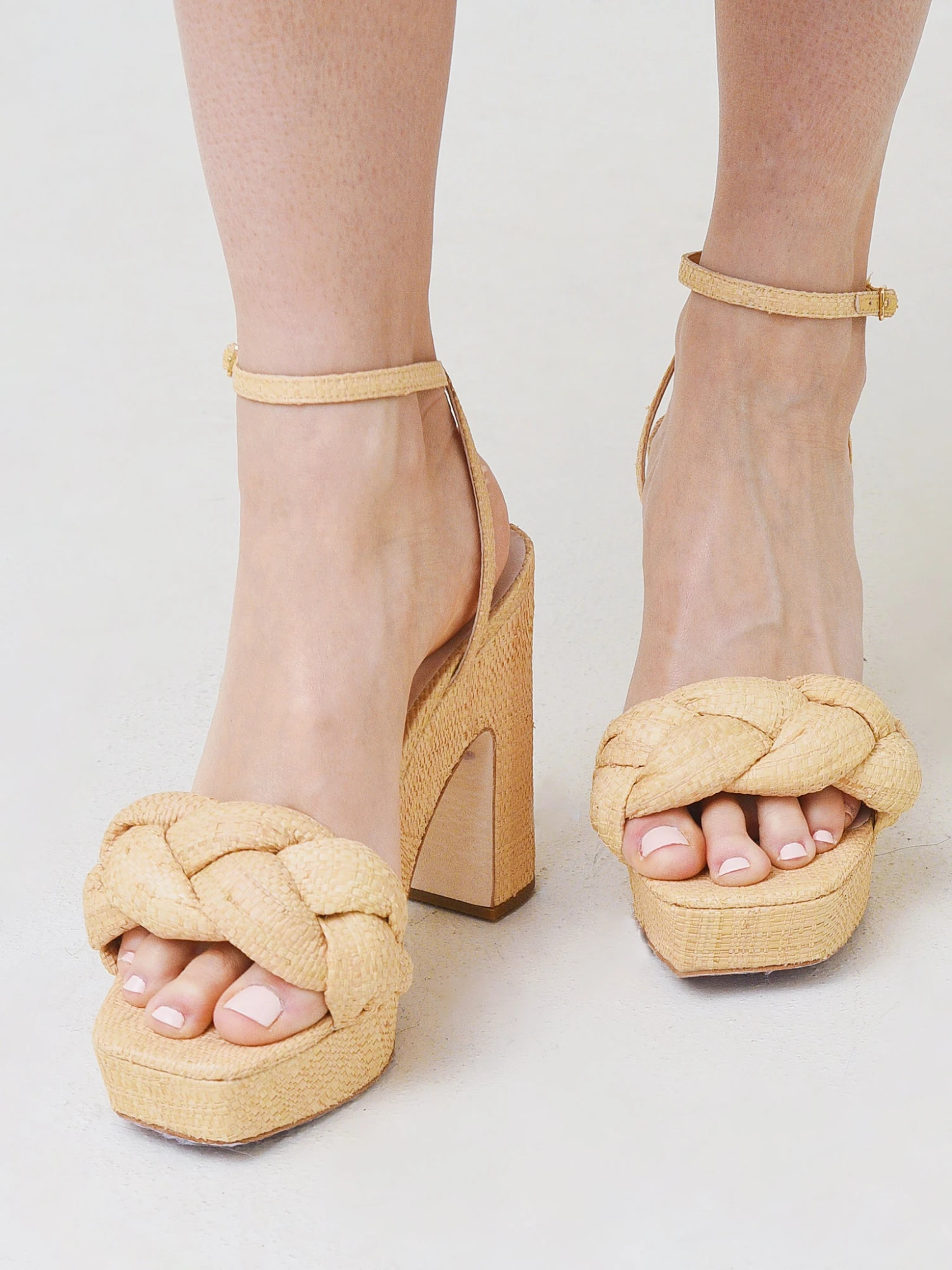 Platform sandal with a puffy braided detail and adjustable ankle strap.