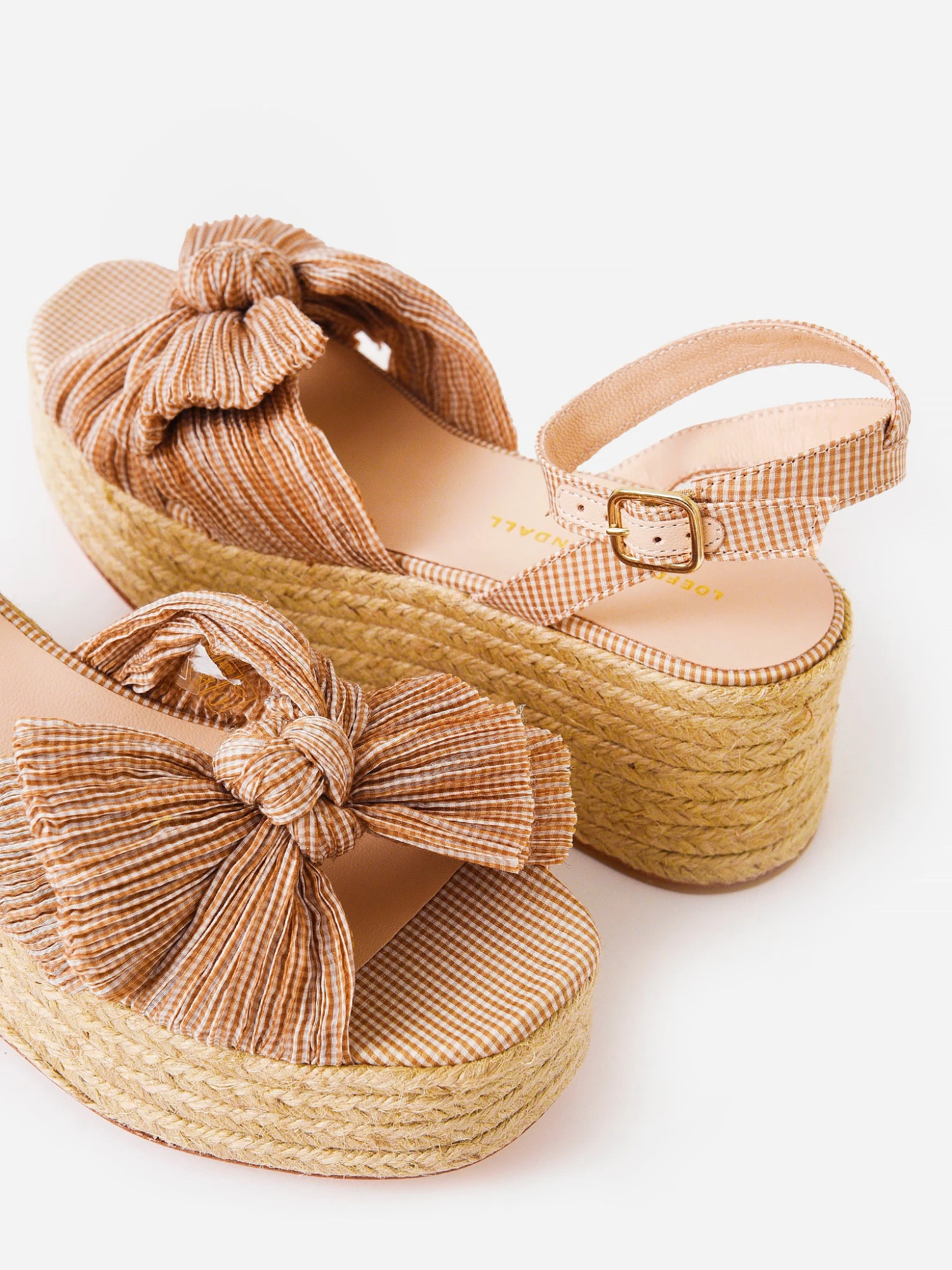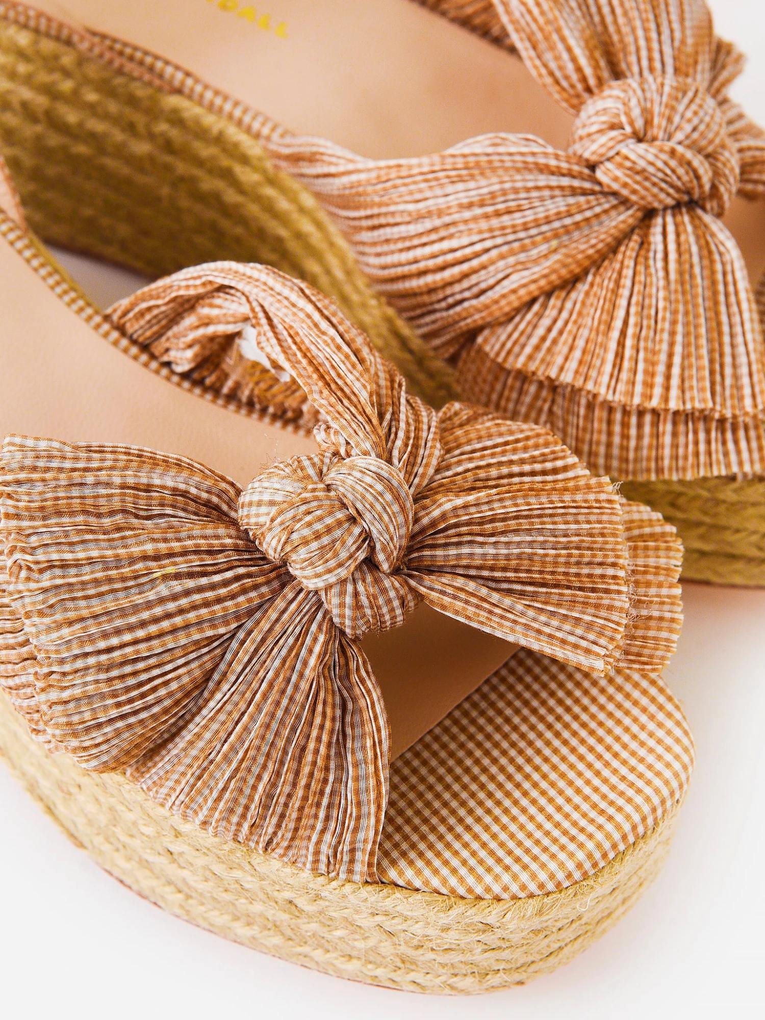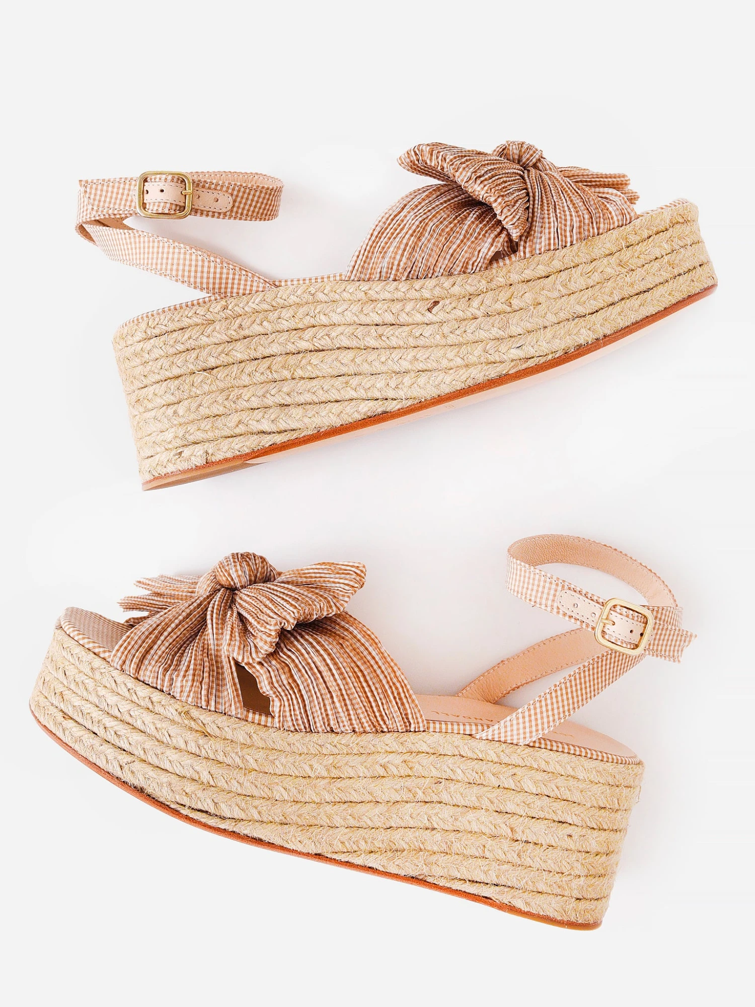 Espadrille-style flatform sandal with a knotted bow detail and adjustable ankle strap.
