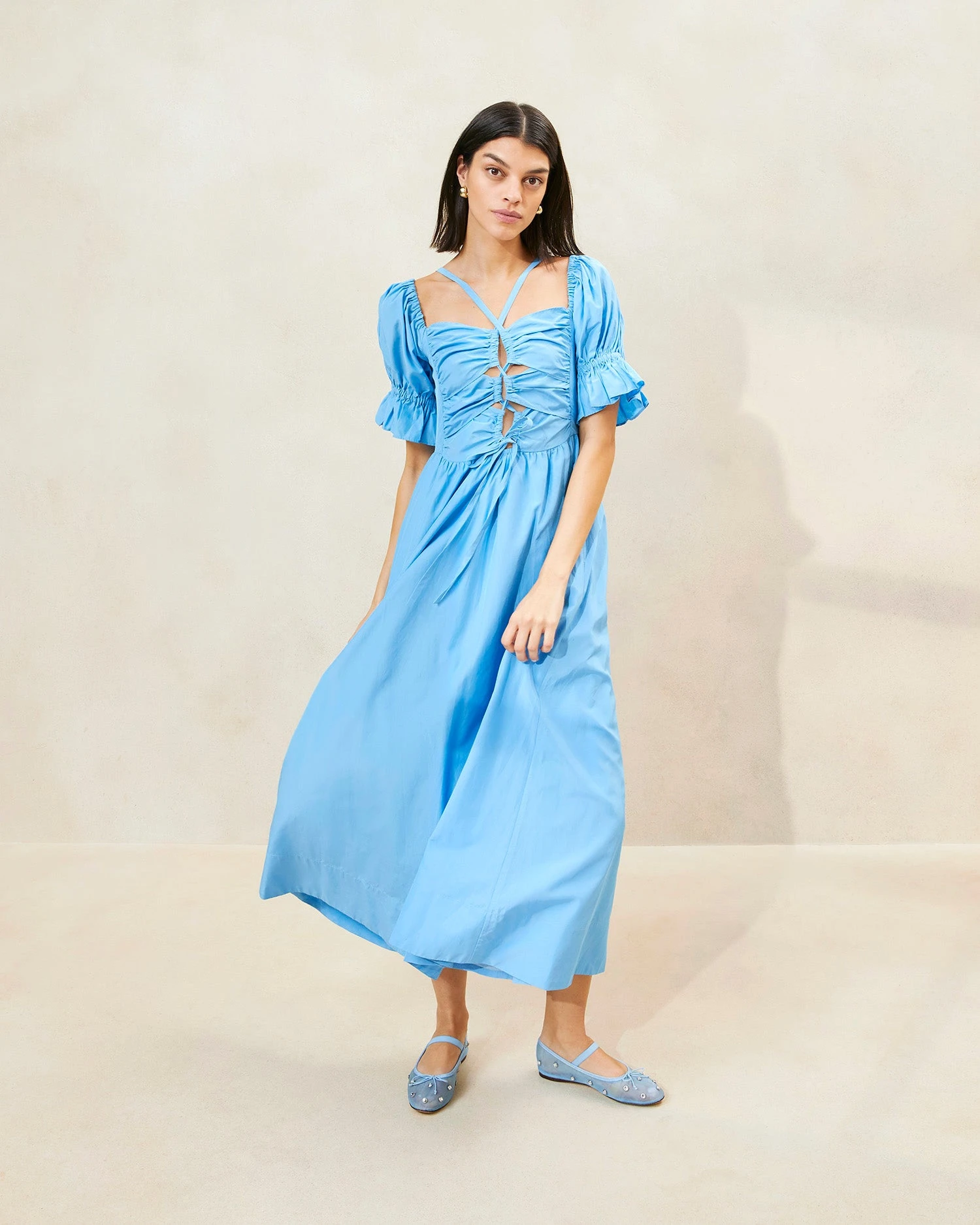 Mid-length dress in a cornflower blue cotton-silk blend. Features puffy sleeves and a gorgeous tie-front. Flares out at the bottom for a relaxed fit while stretch at the back and sleeves imparts a fitted yet comfortable shape.