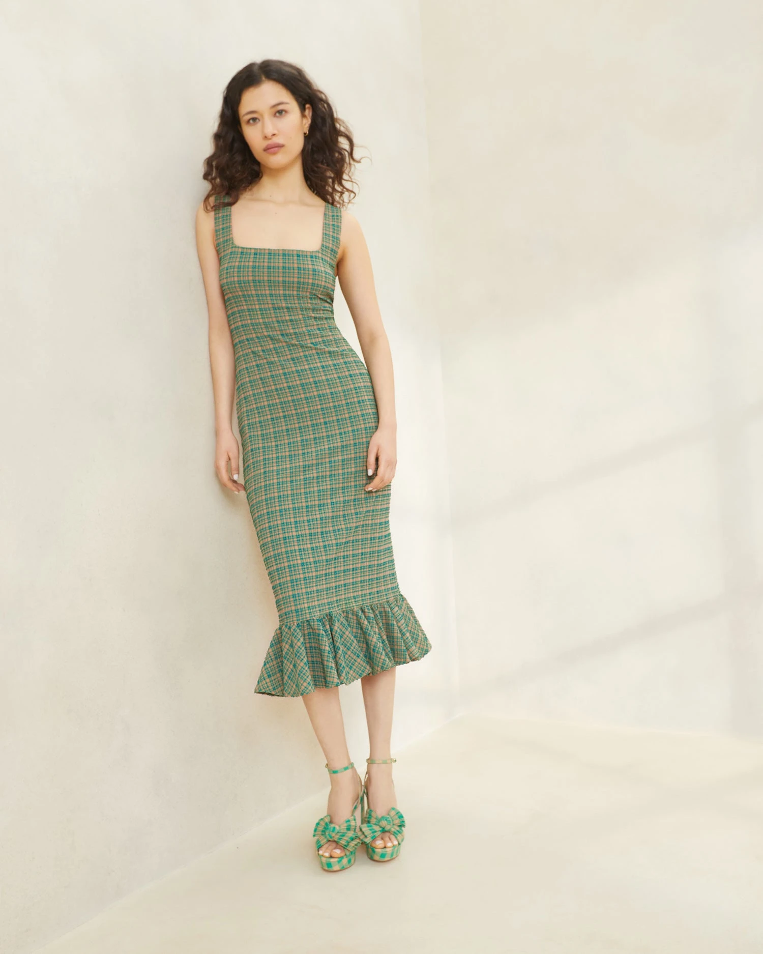 Sleeveless mid-length dress in green and butterscotch plaid-print puckered fabric. Features a square neckline and a ruffled hem. Yessica’s stretchy fabric imparts a fitted yet comfortable shape. Unlined.
